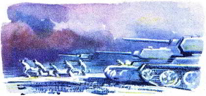 Слепит неприятеля свет, бьёт фашистам в глаза. Помогает, освещает дорогу нашим. Наступают советские танкисты, наступают советские артиллеристы, наступают советские пехотинцы