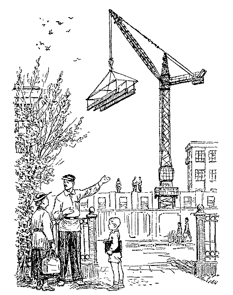 Вижу, забор длинный. И за ним высокая-высокая башня. Будто из железных лесенок сделана. Это и есть кран. У него комнатка с окном и перекладина наверху. С неё тонкие канаты свешены.
