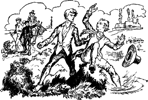Гнев Жака быстро утих. Он считал, что достаточно проучил Леона. Великодушно протянув руку своему врагу, он помог ему выбраться из болота. Как ни злился Леон, как ни хотел поскорей отсюда убраться, он всё-таки выудил из грязи свою великолепную широкополую шляпу. В ней он отличался от всех деревенских мальчишек и не снимал её при любой погоде. Теперь она вся промокла, поля её обвисли, и Леон судорожно разглаживал их грязной рукой. Он был до смешного жалок и походил на мокрую курицу. Потом он стал фыркать и отряхиваться; брызги грязи летели от него во все стороны.