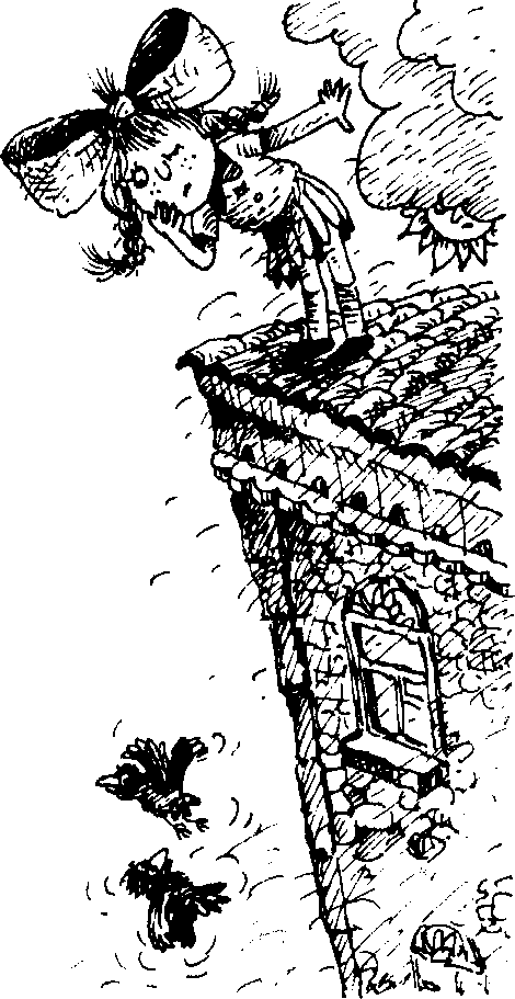 Шла, шла да и очутилась на краю крыши. Глянула вниз ахнула. Вот так высота! Даже дух захватило. Как же быть?