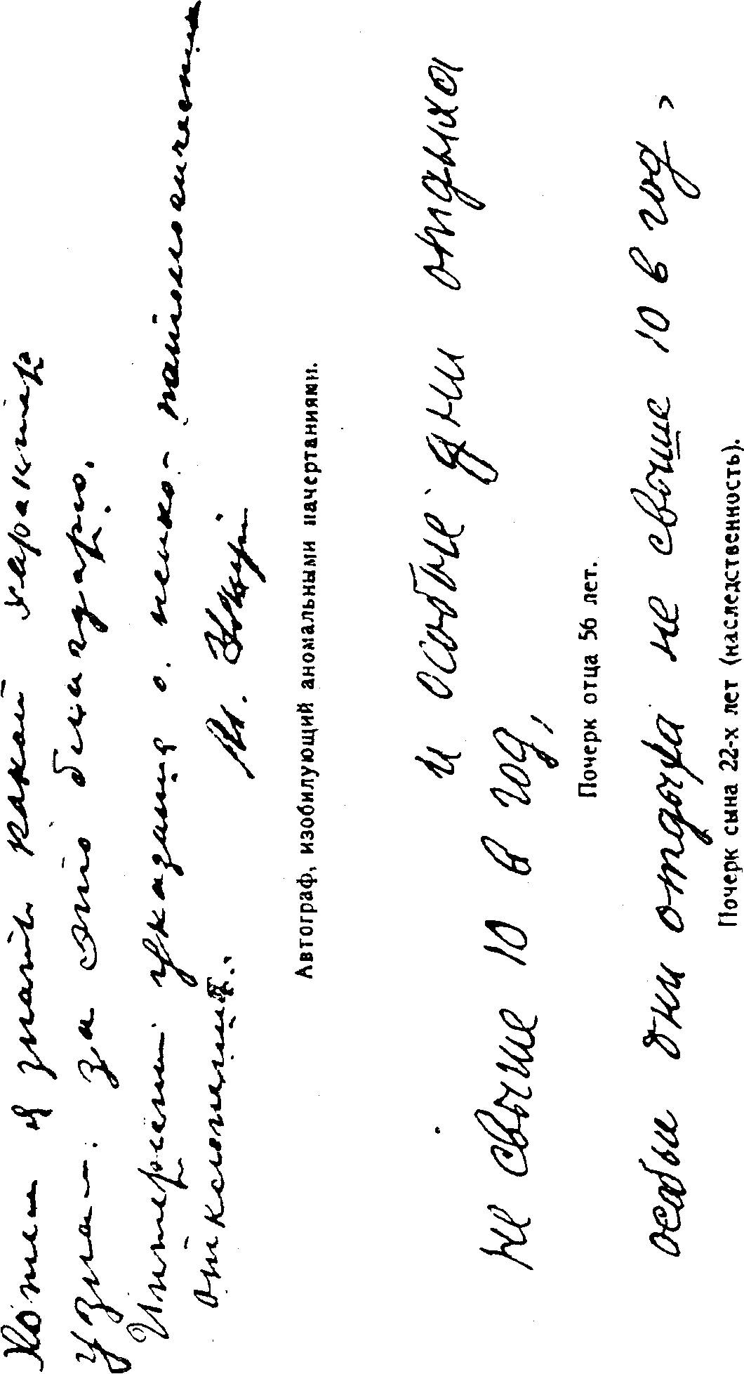 Также интересен вопрос изучения наследственной преемственности почерка. Передача путем наследственности нормальных и анормальных особенностей как соматического, так и психического характера, также находит свое графическое выражение в почерке, который зависит всецело от этих особенностей и ими определяется (см. авт. на стр. 29).