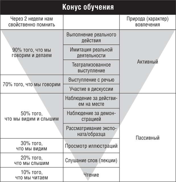 Как видите, чтение (и, соответственно, письмо), на котором основано преподавание в большинстве школ, является наименее эффективным способом удержания изучаемого материала в памяти учащихся.
