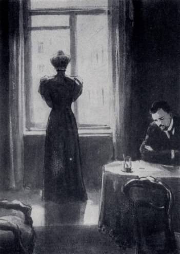 Очень интенсивно развивается в послевоенные годы творчество Кукрыниксов-иллюстраторов. Вновь обратившись к Чехову, они выбрали на этот раз «Даму с собачкой», став чуткими интерпретаторами этой тончайшей, лаконичной и грустной повести. Они создали большой цикл (черная акварель, ГТГ), прокомментировав каждую ее страницу, и главное место в нем заняли Гуров, меняющийся под влиянием большой любви, и Анна Сергеевна ее хрупкость, незащищенность, душевная чистота. Как бы вторым планом, эпизодически проходят люди, окружающие главных героев повести, их характеристика сдержанна всего один-два саркастических штриха, но за ними встает та «куцая бескрылая» жизнь, бессмысленность которой впервые открывается Гурову. В цикл вошла масса живых наблюдений художников. Никогда ранее пейзаж не играл в их работах столь заметную роль. Солнечная Ялта, небольшие виды снежной Москвы и провинциального города все это живет тонкими оттенками рассказа, полно его настроениями. Мягкий, лишенный резких контрастов, построенный на нюансах светотени рисунок гармонирует со сдержанной лиричностью повести.