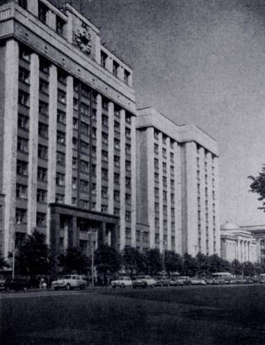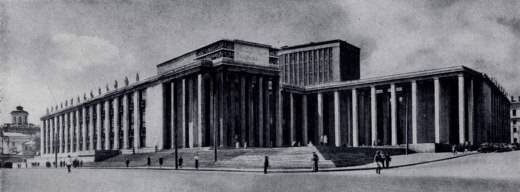 В соответствии с этим планом Москва в течение 30-х гг. стала красивым благоустроенным городом с широкими асфальтированными хорошо освещенными улицами, высокими новыми мостами и набережными, облицованными гранитом, с налаженным городским транспортом и новыми монументальными зданиями. К середине 30-х гг. на месте старого Охотного ряда были выстроены здания Совета Министров СССР (1933 1936, архитектор Александр Яковлевич Лангман, р. 1896) и гостиницы «Москва» (1931 1938, архитекторы А. В. Щусев, Л. И. Савельев, О. А. Стапран), расчищена от ветхих строений обширная Манежная площадь. В течение 30 40-х гг. была расширена и застроена многими новыми долгами главная столичная магистраль улица Горького. Рядом с великолепным зданием бывшего Пашкова дома выросли новые корпуса Государственной библиотеки им. В. И. Ленина (1928 1940-е гг.; архитекторы В. А. Щуко и В. Г. Гельфрейх), где была сделана попытка сочетать суховатую строгость конструктивистского стиля с приемами классицизма.