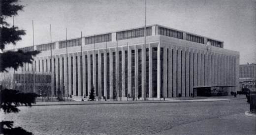 большой группой архитекторов под руководством Александра Васильевича Власова (1900 1962) Дворец спорта и весь спортивный комплекс в Лужниках (1955 1956) и целый ряд других работ, например павильон СССР в Брюсселе (1958), панорамный кинотеатр «Мир» (1958) и кинотеатр «Россия» в Москве,новые станции метро в Ленинграде, Киеве и Москве (направление Новые Черемушки и Юго-Запад). Особо следует отметить остроумное и целесообразное решение станции «Ленинские горы» (1958; архитекторы А. Маркелов, М.Бубнов, М. Марковский, А. Рыжков, Б. Тхор). Она расположена в нижней застекленной части двухъярусного моста через Москву-реку, одним своим концом выходя к спортивному городку в Лужниках, а другим к подножию Ленинских гор, откуда через специальную застекленную эскалаторную галлерею за несколько минут можно подняться на верхнюю площадку, господствующую над городом.