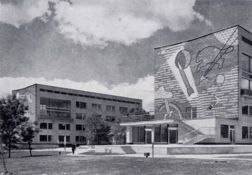Другим крупным сооружением нового архитектурного направления является комплекс Дворца пионеров и школьников на Ленинских горах в Москве (1963). Авторы его молодежный коллектив архитекторов и художников В. Егерев, В. Кубасов, Ф. Новиков, Б. Палуй, И. Покровский, М. Хажакян, конструктор Ю. Ионов, художники Е. Аблин, И. Губарев, И. и А. Дервиз, И. Пчельников благодаря творческому подходу к проблеме синтеза искусств создали целостный архитектурно-художественный ансамбль, удачно использовав для этого сложный рельеф местности, обилие зелени и водоемы. Свободная живописная композиция нового Дворца пионеров чужда парадной торжественности традиционного симметричного построения. Двухэтажная почти сплошь остекленная галлерея, протянувшаяся: во всю ширину обширной Площади парадов, объединяет более высокие архитектурные объемы обсерваторию, три корпуса помещений для кружковых и лабораторных работ, два театральных зала. Активное использование цвета в архитектуре, введение в нее крупномасштабных произведений декоративно-монументальной живописи (в главном портике и на стенах садового фасада) способствовали созданию неповторимого художественного облика этого сооружения. Известный итальянский писатель Джанни Родари, посетивший во время своего пребывания в Москве в 1964 году Дворец пионеров, писал: «Это одно из лучших творений молодой советской архитектуры, которая вложила в него напряженную страсть к обновлению, использованию современных материалов, к рациональности и органичности в украшениях. ..».