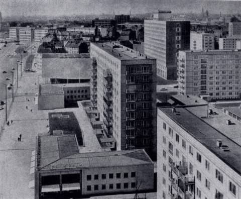 Реконструкция центра Берлина, по причине целого ряда сохранившихся старых зданий и образовавшихся между ними пустырей, представлялась сложным делом. Она началась с комплексной застройки двухкилометрового участка Карл-Маркс-Алле (1952 1954). Планирование и строительство первой центральной аллеи города поставили перед немецкими архитекторами проблему социалистического градостроительства, однако первый опыт в этом плане в целом оказался неудовлетворительным. Архитекторы Г. Хензельман (р. 1905), Р. Паулик (р. 1903;, X. Хопп (р. 1890) и другие, воспитывавшиеся на традициях немецкого функционализма, стремились освободиться от скученности застройки, дать центральной магистрали много света, солнца, воздуха. Но, несмотря на цельность архитектурной композиции, в ее сооружениях проявилось увлечение репрезентативными задачами, неоправданным декорированием фасадов. Недостатки были и в самой планировке (периметральная застройка прилегающих к магистрали территорий, недостаточное внимание к организации внутриквартального пространства). Кроме того, строительство зданий шло медленными темпами.