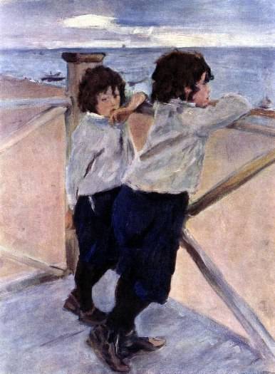 Иную роль играет пейзаж в лирическом портрете сыновей художника на взморье («Дети», 1899; ГРМ). Детские фигурки вынесены тоже на первый план, но они согреты душевным отношением художника к своим моделям, полным детского очарования. Показана характерность лиц, позы; оба мальчика объединены в поэтическую группу. Цельности композиции способствует характер колорита тонкое соотношение близких (серых и синих) тонов пейзаж, распространяющийся вдаль и вширь. Море привносит неповторимое очарование, поэзию, настраивает на лирический строй мысли и чувства. В этой жанровой портретной композиции (как в детских группах скульптора Трубецкого) нет определенного события, суть ее в настроении.