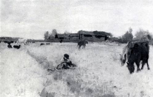 Деревенские пейзажи Серова народны в глубоком смысле слова, они согреты сыновней любовью к родине, к трудовому человеку. Его дерзвня населена людьми, которые заняты своим делом. По дороге куда-то спешит баба в телеге, заворачивает за угол сарая крестьянин в дровнях, что-то мастерит мальчик-пастушок. На пастбищах пасутся лошади. Жизнь идет своим чередом, художник правдиво, объективно и вместе с тем поэтично фиксирует это течение жизни. Трезвая оценка Серовым крестьянства присутствует и тогда, когда ему надо изобразить персонажей, заслуживающих юмора или сатиры (иллюстрации к басням