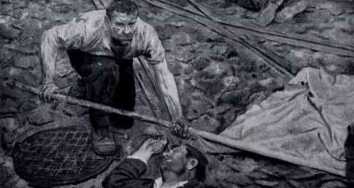Высоким драматизмом отмечены исторические композиции Г. М. Коржева (р. 1925). Лучшее произведение художника триптих «Коммунисты» (ГРМ), состоящий из картин «Поднимающий знамя» (1959 1960), «Интернационал» (1957 1958), «Гомер» (1958 1960). Этим картинам свойственна внутренняя патетика, большая сила чувства при очень ясной форме рассказа. Художник строит повествование на немногих фигурах, выделенных крупным планом, стремится к определенности состояния героя. В картине «Поднимающий знамя» немногими деталями (грубый булыжник мостовой, трамвайные рельсы) дается представление о месте и времени действия эпохе революционных выступлений русского пролетариата. Благодаря этому приобретает конкретность образ русского рабочего-большевика, поднимающего знамя, выпавшее из рук убитого товарища. Его грубые мозолистые руки крепко сжимают древко, в изможденном лице затаенная ненависть и готовность отдать жизнь во имя свободы и справедливости. Хотя картина отличается большой сдержанностью в колористическом отношении, сила ее эмоционального воздействия велика. Алый, словно пролитая кровь, цвет знамени звучит как набат в сопоставлении с грязно-серой булыжной мостовой.
