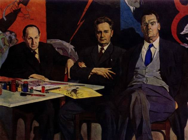 П. Д. Корин. Кукрыниксы (групповой портрет художников М. В. Куприянова, П. Н. Крылова и Н. А. Соколова). 1958 г. Москва, Третьяковская галлерея. - илл. между стр. 200 и 201