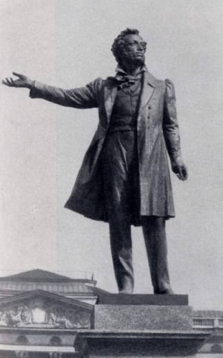 В 1957 г. в Ленинграде был сооружен памятник А. С. Пушкину, который создавался в творческом соревновании крупных советских ваятелей. Победу в конкурсах одержал молодой скульптор Михаил Константинович Аникушин (р. 1917), ряд лет работавший над воплощением образа поэта в станковой и монументальной пластике. В окончательном варианте, по которому был создан монумент для Ленинграда, ему удалось выразить главные черты пушкинского гения. Состояние творческого вдохновения, душевный порыв переданы в естественном жесте, одухотворенности всей фигуры. В сочетании простоты, естественности с классической ясностью и строгостью обаяние созданного образа. Не