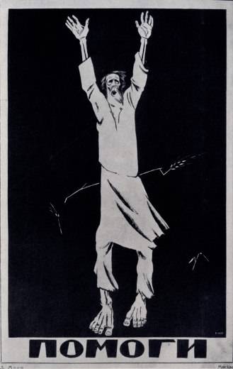 Уже здесь строгий отбор главного организует художественный образ. Лаконизм становится еще более сильным художественным средством в листе «Помоги», выполненном в связи с неурожаем и голодом в Поволжье. Здесь все кратко, как возглас, предельно заострено, утрированно выразительно: и жест иссохших рук старика, вскинутых, как при горестном обращении к народу, и пропорции фигуры, и сопоставление ее с фоном, и хрупкость пустого белого колоска, подчеркнутая всей непроницаемой чернотой фона. Фигура старика похожа на призрак, но, высветленная беспощадным белым цветом, она реально занимает всю высоту листа, она существует во всей своей страшной правдивости. Жест главное в этом плакате. Чуть отдаленное в глубину лицо сведенный в крике рот, черные провалы глазниц воспринимается потом, а прежде всего резкий взмах рук, ужасающая худоба человека. Народное бедствие, горе в своем обнаженном обличье встают за героем мооровского произведения. Трагически звучит аккорд черно-белого. Концентрированная сила чувства, емкость детали, слитность изображения и текста отличают этот превосходный плакат.