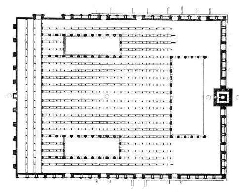 Выдающимся и вместе с тем характерным памятником монументальной архитектуры этого времени является мечеть Кутубийя в Мар-ракеше (12 в.). В молитвенном зале мечети сто пятьдесят столбов образуют семнадцать продольных нефов, завершенных своего рода трансептом, идущим вдоль стены с михрабом. Массивные, несколько приземистые по пропорциям столбы несут высокие подковообразные преломленные в замке арки. В перспективе арки образуют анфиладу, проникнутую ритмом величественного и спокойного движения (илл. 26). Однако, как и в Кордовской мечети, в мечетях Магриба архитектурное пространство имеет множество аспектов. Анфилады арок пересекают короткие продольные нефы, перекрытые плоским или двускатным деревянным потолком. Некоторые нефы завершаются небольшими куполками, возвышающимися над трансептом у михрабной стены. Наконец, сами столбы и арки, часто неодинаковые по форме, воспринимаются в разных ракурсах. Все это вносит в интерьер богатый и сложный ритм чередования архитектурных форм.