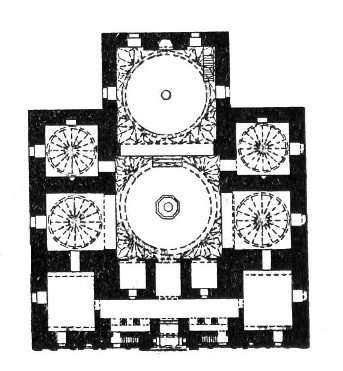 Османское зодчество в своем развитии прошло два основных этапа. Первый, охвативший по времени 14 и первую половину 15 в., связан со строительством в столичной Брусе (Бурсе) и в ряде других городов Малой Азии. В этот период турецкие зодчие, сохраняя строительные приемы сельджукского времени, стремились к простым геометрически правильным формам здания. Наиболее значительными памятниками, отразившими тенденции первого этапа, являются культовые здания: Улу-Джами (14 в.) и Йешиль-Джами (Зеленая мечеть, 1423 г.) в Брусе, Нилюфер-хатун имарет и Йешиль-Джами (обе 14 в.) в Изнике и другие постройки. Улу-Джами представляет большой зал, разделенный рядами столбов, поддерживающих своды. Йешиль-Джами в Брусе состоит из двух расположенных по главной оси здания больших купольных залов. К первому, в центре которого находится мраморный бассейн для омовения, справа и слева примыкают небольшие подкупольные пространства. Интерьер облицован расписными изразцами (с ,преобладанием зеленого цвета) и имеет очень своеобразный переход от стен к кругу купола, исполненный в виде граненого фриза. Рельефными изразцами богато декорирован также входной портал. Композиционный прием, состоящий в расположении по бокам главного молитвенного зала небольших купольных помещений, характерен и для других культовых зданий Брусы, а также для ранних стамбульских мечетей.