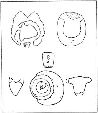 Склоны кургана после этого обложили камнями. Основная ось кургана совпадала с осью яйцевидной насыпи и ее первой досыпки: в направлении их каменной выкладки сделали ворота в виде двух разделенных порожком стел. Ворота могли использоваться для наблюдений за Луной и Солнцем на восходе в день летнего и на закате в день зимнего солнцестояния. Ось восток запад, фиксирующая весеннее и осеннее равноденствия и проходящая через центр выемки Луны, обозначена двумя вырезанными из камня головами крупных рогатых животных. Конфигурации их различны и символизируют, вероятно, некие астральные божества, воплощавшиеся в корову и быка (рис.9).