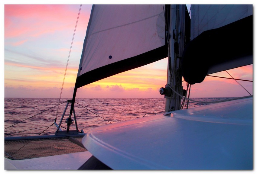 Погода, несмотря на обещанные по прогнозу 1520 узлов попутного ветра, за последние три дня изменилась и оказалось слабоветренной. Скорость ветра не превышала 79 узлов при полном бакштаге и, чтобы не изнашивать паруса хлопаньем на ветру, пришлось заводить двигатель. В целях экономии топлива решили идти только на одном двигателе и, как оказалось, это было верное решение, т. к. скорость на двух двигателях увеличивалась лишь на 1 узел, а топлива расходуется в два раза больше. На это свойство катамаранов обратил внимание наш знакомый яхтсмен кругосветчик Хавьер, с которым случайно столкнула судьба пару лет назад. Сам он, испанский дизайнер однокорпусных яхт, в третью кругосветку решил идти на катамаране, из-за удобства при длительных переходах по океанским просторам.
