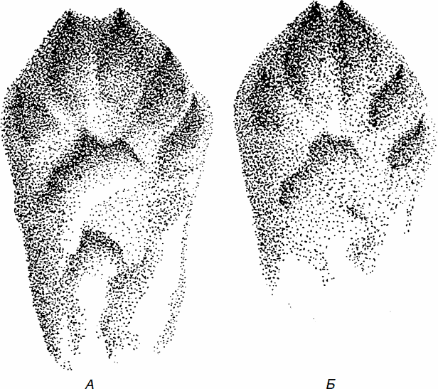 Рис. 24. Отпечатки левых передней (А) и задней (Б) лап росомахи (ум. примерно вдвое). Рисунок Е. Н. Матюшкина.[34]