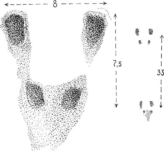 Рис. 59. Отпечаток четырех лапок летяги на прыжке в рыхлом снегу (е. в.). Группа отпечатков имеет форму трапеции, как у белки, но сами отпечатки заметно меньше, прыжки короче. Общий вид следов летяги на прыжках. Шарьинский р-н Костромской обл. Март 1935 г.