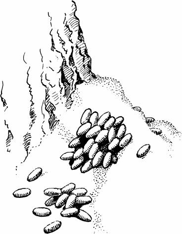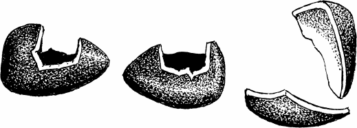 Рис. 65. Орешки корейского кедра: слева погрызенные красными лесными полевками («бочоночки»), справа расколотые бурундуком (ув.). Приморская обл. Июнь 1928 г.