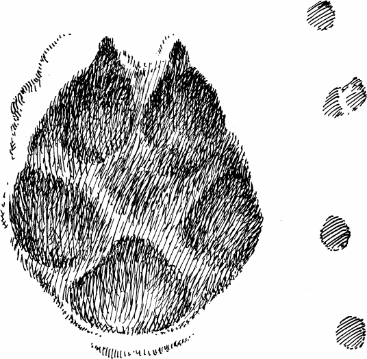 Рис. 4. Отпечаток правой передней лапы среднерусской лисицы на рыхлом мелком снегу. Подошвы ног к зиме густо зарастают шерстью след получается широкий и расплывчатый (е. в.) Окр. Москвы. Февраль 1945 г. (сравни с рис. 5. и 288).