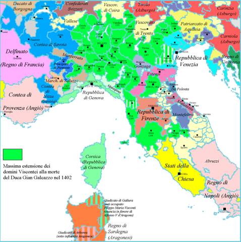 Интригами и умелыми действиями своих кондотьеров, Миланское Герцогство прирастало территориями Висконти взяли Верону (1387 г.) и Виченцу, а затем Падую (1388 г.). В дальнейшем были присоединены Пиза (1399 г), Перуджа, Ассизи, Сполето и Ночера (1400).