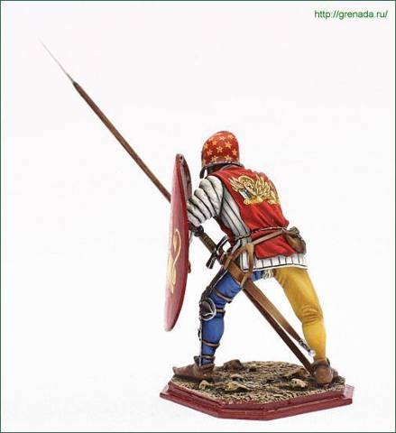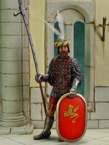Вы же знаете мою недоверчивость к комплектации войск и обмундирования? Вот и сейчас мне кажется, что художник изрядно польстил одоспешенности своих соотечественников. Через полвека, очевидец битвы при Монлери, будет ядовито замечать, что даже у богатых шевалье нет нагрудника, или даже шлема. С другой стороны, это будет рыцарское ополчение, а на службе Венеции были профессионалы. Логично и прикупить инструментов и защиту, если у тебя работа такая. Мне нравится вот эта фигурка венецианского ополченца и она как раз на начало XV века: