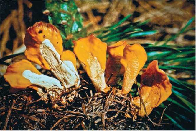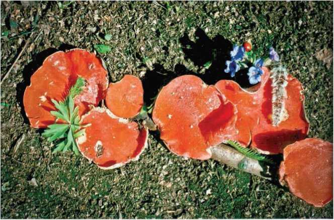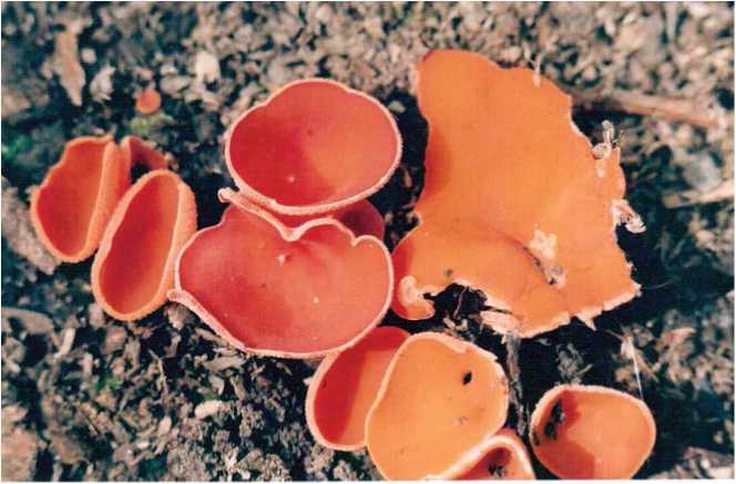 Эти небольшие, диаметром 2-10 см грибы привлекают посетителей леса роскошной яркой окраской. Появляются они после первых теплых дождей и растут в течение всего лета и осенью. Развивается этот гриб обычно большими группами на сыроватых песчаных почвах. Предпочитает освещенные места, например обочины лесных дорог и тропинок, края ям. Часто встречается на свежих раскопах или потревоженной, разрытой почве. Плодовое тело сидячее, в раннем возрасте полушаровидное, затем блюдцевидное. В старости неправильно-плоское, во,пнисто-лоскутное, часто трескается. Внутренняя, спороносная поверхность гладкая, ярко-оранжевая, снаружи гриб более светлый. Ножка отсутствует, внизу имеет коричневатое основание. Мякоть восковидная, тонкая, очень ломкая, светло-красноватая, без особого запаха и вкуса. Гриб съедобный, но малоценный.