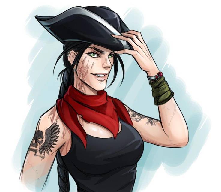 Энергичные шаги за дверью, в едва успевшие раскрыться створки бодро ворвалась крепкая, стройная дама и расположившись по стойке «вольно», на гвардейский манер, прожгла каждого присутствующего ярко зеленым взглядом из-под черной треуголки. Ее длинная, черная коса жила кажется своей жизнью, как будто хвост крупной кошки, а массивный шрам на правой щеке, уходящий вниз на шею и далее за ворот и множество колец в ушах, создавали образ практически пиратский.