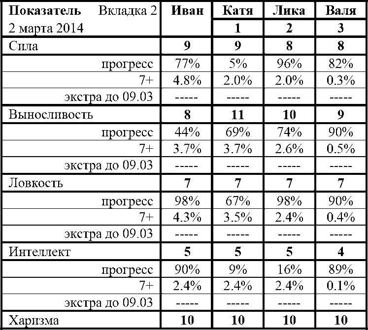 Энергии больше не было, так что я посмотрел на Стату, чтобы оценить прогресс за неделю. У всех, кроме Вали, всё было стандартно. Катя начала осваивать работу с копьями и бросила заниматься метанием топора. Рейнджершу я, как и обещал, никак не напрягал тренировками. Но небольшой рост по стрельбе из двуствольных ружей у неё всё же был. Девушка там, в Марий Эл, во всю шмаляла на охотах с отцом. Это радовало, в отличие от остального её прогресса. Там всё было почти по нулям. Отпуск, в плане прокачки, довольно вредная вещь.