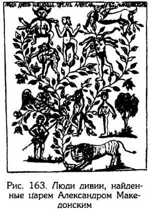 Существует также известное и очень популярное в прошлом на Руси, начиная с конца ХV века, предание о том, что Александр Македонский после завоевания Индии и общения с тамошними мудрецами вовсе не повернул назад, а с небольшим отрядом устремился к Северу, дабы достичь райского Белого Острова и выведать там тайну бессмертия. Двигаться пришлось до самого края земли, через царство долгой (читай полярной) ночи, где жили разные «дивьи люди» (рис. 163), переваливать через высокие горы, «иже холми Севернии зовутся», как сказано в древнерусском тексте переводного романа «Александрия» о самом знаменитом в древности завоевателе мира.