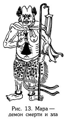 В буддийской мифологии чрезвычайно популярен Мара (рис. 13) Божество, персонифицирующее зло и всё, что приводит к смерти живые существа. У Мары древнейшая (добудистская) родословная. Но после рождения Будды злокозненный демон превратился в гланого антагониста и искусителя царевича Гаутамы, которого безуспешно пытался победить с помощью несметного воинства темных сил, олицетворяющих ад: