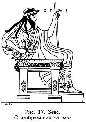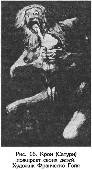 Первое поколение, породившее титанов, гигантов, циклопов и сторуких великанов гекатонхейров, это Уран-Небо и Гея-Земля. После оскопления и низвержения отца Урана к власти пришли титаны во главе с Кроном (Сатурном), который в скором времени принялся пожирать собственных детей (рис. 16). Единственно спавшимся оказался будущий владыка Олимпа Зевс (рис. 17). Возмужав, он заставил отца изрыгнуть назад проглоченных детей и вскоре выступил вместе с ними против титанов. В результате кровопролитного сражения, которое длилось не один год и известно под названием титаномахии, младшее поколение свергло старшее Победители поступили со своим отцом, дядьями и тетками достаточно сносно: после недолгого низвержения в подземный Тартар их отправили в почетную ссылку на северные Острова Блаженных.
