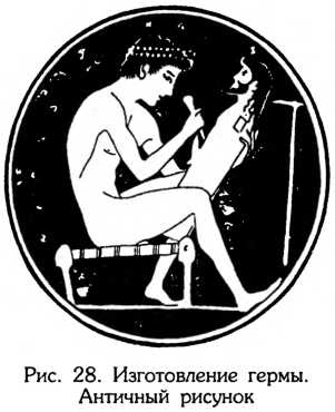 От имени Гермеса произошло название «герма» (переводится как «груда камней», «каменный столб»). В Древней Греции и ее колониях существовал тщательно разработанный ритуал изготовления герм (рис. 28). Они устанавливались на дорогах для указания расстояний и представляли собой закругленный столбовидный стержень с тщательно обработанной головой и подчеркнуто выраженным мужским половым органом фаллосом в возбужденном или спокойном состоянии. Гермами именовались и кучки камней различной величины и имеющие пирамидальную форму. Знаток древнегреческой культуры Мартин Нильссон следующим образом описывает их назначение. Когда кто-то проходил мимо кучи камней, он, должно быть, добавлял к ней еще один камень, а если на вершине этой кучи был поставлен большой камень, прохожий клал туда немного еды в качестве приношения. Он делал это по традиции, не сознавая истинных причин, понимая только, что в этой куче камней и в большом камне на верхушке живет Бог. Он называл этого Бога Гермес, по названию кучи камней (гермы), в которой тот обитал, а большой камень именовал гермой. Такие гермы были хорошими ориентирами для путника, идущего безлюдной дорогой из одного селения в другое, и Боги обитатели герм стали покровителями странствующих.