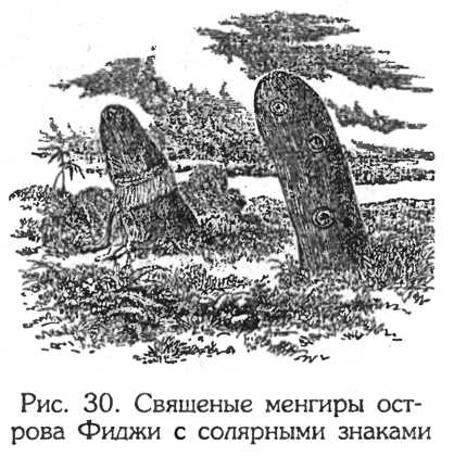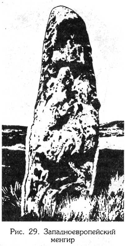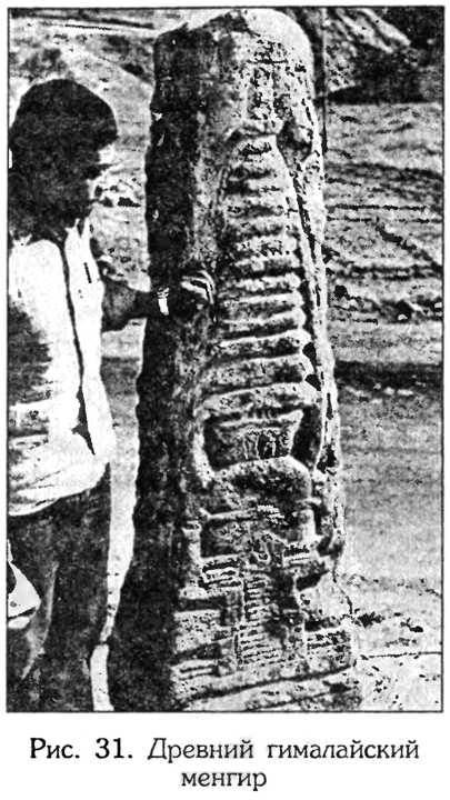 Целые комплексы менгиров были открыты во время экспедиции Рерихов в Гималаи, Тибет и другие регионы Центральной Азии. Так, в До-Ринге, возле соленого озера Пангонг, Рерих и его сын обнаружили значительный по размерам комплекс: восемнадцать параллельных рядов менгиров и каменных плит, ориентированных с запада на восток и ведущих к двум полукружиям менгиров. В центре высились еще три каменные колонны и алтарный стол. По словам Рериха, этот грандиозный комплекс в самом центре Тибета имел точно такую же структуру, как знаменитая аллея каменных столбов в Карнаке во Франции. Ученый обнаружил также несколько других подобных комплексов и множество менгиров, разбросанных по всему Тибету. Многие древние менгиры превращены в объекты буддийского поклонения (рис. 31). Летом 1998 года мой старший сын Никита,