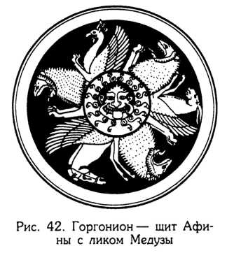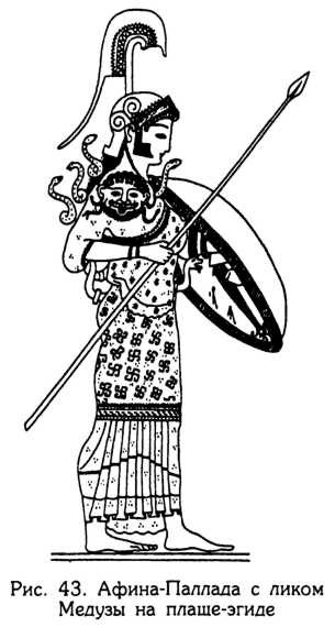 Но женская мстительность не знает границ. Афине было мало морально уничтожить Медусу ей потребовалась еще и голова соперницы. Вот почему, некоторое время спустя, она отправляет назад, в Гиперборею, своего сводного брата Персея и, по свидетельству многих, сама сопровождает его. Обманным путем Персей и Афина вместе расправились с несчастной Медусой: по наущению Паллады сын Зевса и Данаи отрубил горгоне голову, а Афина содрала с соперницы кожу и натянула на свой щит, в центре которого поместила изображение головы оболганной Морской девы. С тех пор щит Афины по имени низвергнутой соперницы носит название «горгонион» (рис. 42). Лик Медусы украшал также эгиду (доспех или же плащ-накидку), которую носили Зевс, Аполлон и все та же Афина (рис. 43).