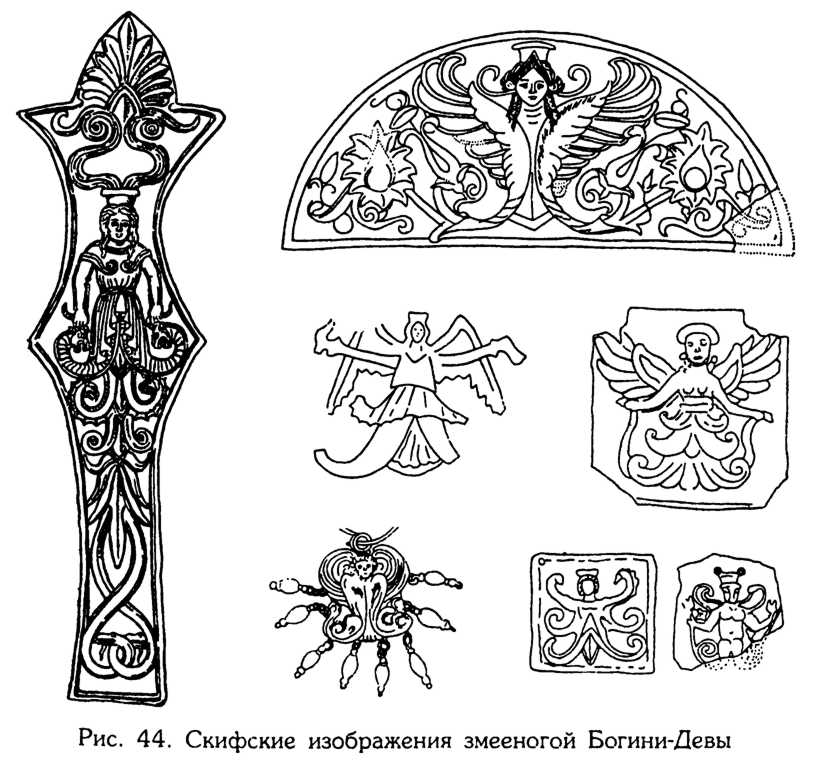 Память о носительнице гиперборейских традиций Горгоне Медусе у народов, населявших в разные времена территорию России, не прерывалась никогда. Змееногая Богиня-Дева, которая вместе с Гераклом считалась греками прародительницей скифского племени, не что иное, как трансформированный образ Медусы. Лучшее доказательство тому не вольное переложение мифов в Геродотовой «Истории», а подлинные изображения, найденные при раскопках курганов (рис. 44).