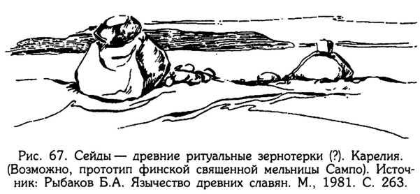 Академик Б. А. Рыбаков высказал оригинальную и вполне обоснованную мысль, что если в «Калевале» и описывается мельница, то это ни какой-нибудь классический ветряк или колесное сооружение на речной запруде, а древняя каменная зернотерка, символически олицетворяющая счастье и благоденствие. На Севере такую глубоко закодированную смысловую нагрузку как раз и несут саамские сейды (см: Рыбаков Б. А. Сампо и сейды // Новое в археологии СССР и Финляндии. Л., 1984, С. 73) (рис. 67).