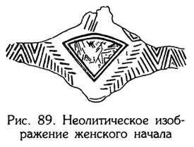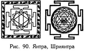 То, что таинственные рисунки на дне Сейдозера начертаны с помощью такого экзотического средства, как ил, ничего не значит. В конце концов, писчий мел под микроскопом представляет собой породу, сцементированную из кальцитовых скелетов древних микроорганизмов. В русле приведенных объяснений следует, вероятно, рассматривать и увиденные поисковиками три года назад подводные треугольники: их контур вполне мог быть образован сгустками придонного ила, которые со временем распались. «Автор» тот же планетарная и космическая ноосфера. Сам по себе символ треугольника соответствует женскому началу и естеству, что прослеживается в различных архаичных культурах (рис. 89) вплоть до наших дней (например, йони в индуизме). Священным символом грозной богини Кали являются пять равносторонних треугольников, вставленных один в другой и помещенных внутрь восьмилепесткового лотоса. Известны также янтры (янтра тантрическая диаграмма), где треугольники образуют орнамент различных конфигураций (рис. 90).