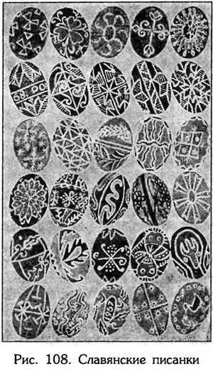 Неоспоримым свидетельством древнейшего почитания у славян яйца как символа жизнепреемственности и космического возрождения является также обычай крашения и расписывания яиц. Обычай, в настоящее время увязанный с христианской Пасхой, в действительности уходит в самые дальние глубины этнической истории славян и индоевропейцев. Археологи находят писанки (расписные яйца) в древних курганах; в форме народного декоративного искусства они широко распространены у восточных славян (рис. 108). Между прочим, в свое время на Полтавщине в этнографическом отделе города Лубны существовала коллекция, где были собраны тысячи писанок бесценных памятников архаичной культуры. Писанки донесли до наших времен свидетельство о древнейших космологических и космогонических представлениях, социальных ориентирах и предпочтениях, эстетических ценностях и идеалах. На яйцах воспроизводились солнечные, лунные и звездные знаки, другие смыслозначимые символы, означавшие и родоплеменную принадлежность. По архаичным орнаментам, как по опорным пунктам и вехам памяти, можно восстановить далекое прошлое народов России и основные этапы становления и развития человеческого бытия.