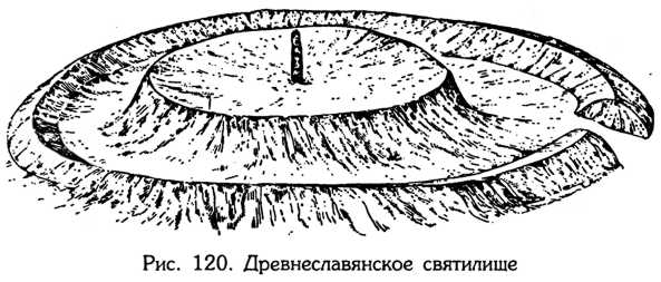 В музеях страны хранятся мелкие бронзовые изделия, относящиеся к первым векам нынешнего тысячелетия, из Смоленщины, Приладожья, других краев и областей: утки, гуси, собачки, зайцы, разные «неведомые звери» сплошь испещренные солнечными и иными «небесными» символами. До недавнего времени в Архангельской губернии (Холмогоры) процветал косторезный промысел по изготовлению орнаментированных ларцов, украшенных резными кружками с точками посередке. Наконец, нельзя не отметить, что древние (языческие) славяно-русские святилища в проекции сверху также представляли собой громадный круг с «точкой» (идолом или костром) посередине (рис. 120). Любопытно, что культовые сооружения точно такой же конфигурации и с множеством костров но в виде изгородей из срубленных молодых деревьев и кустов отмечены этнографами также у североамериканских индейцев.