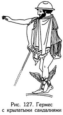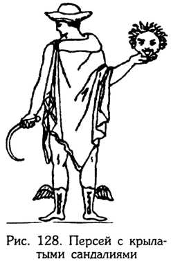 Крылатую атрибутику (летающую сандалии) имеет и Бог Гермес (рис. 127): он, как уже рассказывалось в 1-й части, также был тесно связан с северными широтами. И не мог быть не связан коль скоро прапредки эллинов были родом из своей индоарийской полярной прародины, откуда они и двинулись на Балканы после климатического катаклизма, унеся с собой и архаичную мифологию. Персей Гиперборейский завладел своими знаменитыми крылатыми сандалиями (рис. 128) тоже на родине Солнца в Гиперборее. Для этого ему пришлось обмануть сестер Горгоны Медусы грай (старух), у которых был один-единственный зуб и один-единственный глаз на троих. Между прочим, сходная мифологема с единственным зубом встречается и в одной из волшебных сказок аляскинских эскимосов. А сколько еще подобных совпадений, включая и воспоминания о летающих существах в мифологии полярного и приполярного региона!