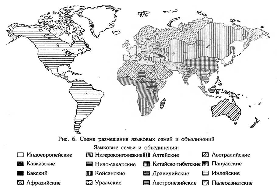 Как видим, аргументов в пользу языкового моногенеза более чем достаточно. Всего известно свыше 30 самостоятельных языковых семей (рис. 6) точная классификация затруднена из-за неясности: на сколько обособленных языковых семей подразделяются языки индейцев Северной, Центральной и Южной Америк; в различных энциклопедиях, учебной и справочной литературе их число колеблется от 3 до 16 (причем ряд лингвистов вообще предполагает отказаться от традиционной классификации и перейти к группировке на совершенно ином основании). Языковые семьи не равномощны: например, на языках китайско-тибетской семьи говорит около миллиарда человек, на кетском же языке (обособленная семья) около одной тысячи, а на юкагирском языке (тоже обособленная семья) менее 300 человек (и кеты и юкагиры малые народности России).