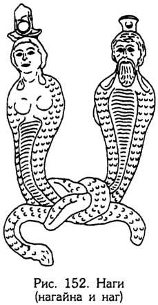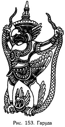 Наги (рис. 152) мудрые полубожественные существа ведийского и индуистского пантеона, полулюди и полузмеи их змеиное тулувище оканчивается человеческой головой. Они хозяева Подземного царства Паталы, где они живут в блистающих золотом и драгоценностями дворцах и владеют несметными сокровищами земли. Им принадлежит тайна эликсира бессмертия, с его помощью они способны не только неограниченно продлевать жизнь и сохранять вечную молодость, но и оживлять мертвых (русские предания о «живой и мертвой воде» проистекают именно отсюда). Наги легко принимают человеческий облик и часто вступают в любовную связь со смертными людьми. Особенно изощрены в любовных утехах красавицы-нагини. Но жизнь их вовсе не полна одного лишь благополучия: они находятся в непрерывной и далеко не победоносной войне с птицечеловеком Гарудой (рис. 153) и его воинством. Представляется, что в обоих случаях мы имеем дело с обобщенной тотемной символикой. Кроме того, образ Гаруды смыкается со всей вереницей древних птицелюдей, прообраз которых, несомненно, восходит к Гиперборее и ее летающему народу.