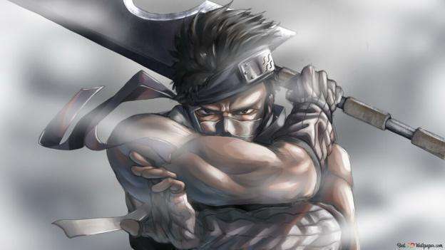 Вот Забудза уже раненый сражается с Какаши что держится с кровоточащей рукой.