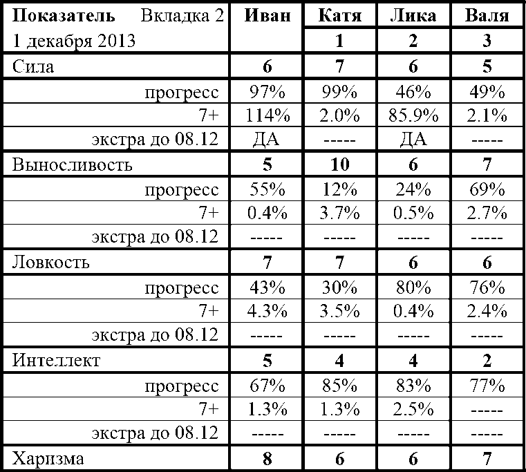 Мы выбрали на сегодня Германию. Попивая пиво, я посчитал сумму очков в наших Параметрах. У меня она была равна 33.63035, у Кати - 36.27687, у Лики - 30.35387, у Вали - 29.73617. Катю рейнджерша сможет догнать за счёт Очков от Уровней, а вот я с Ликой - только за счёт Бонусных Очков. За счёт них я и применил на следующую неделю Экстрарост на Силу ещё раз к себе и Лике.