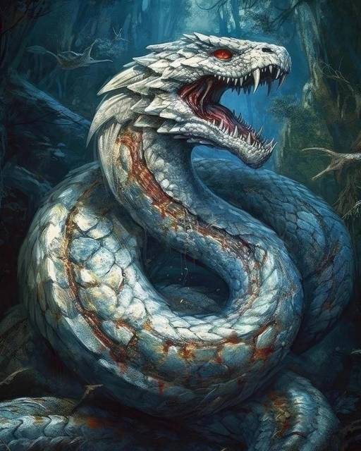 Буквально возле пещеры, раскинул своё длинное тело громадный, чешуйчатый белый змей Его голова была раза в три больше, чем моё тело, а длинные, острые, как бритва клыки, отражали на себе лунный свет.