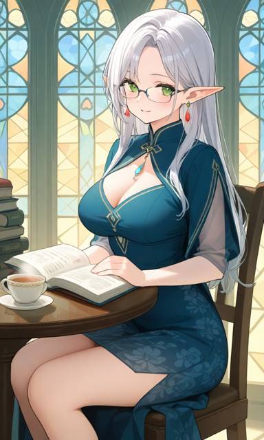 Ее практически белоснежные волосы были распущены и доходили до ее поясницы, немного сверкающие зеленым глаза неспешно скользили по страницам книги за линзами тонкой работы очков, а довольно массивные рубины в серьгах так же, как и глаза, немного светились изнутри.