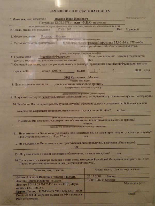Первый OCR анкета-заявление для получения загранпаспорта, сфотографированная со стенда камерой коммуникатора HTC Touch HD. Камера хоть и 5-мегапиксельная, но поганая-препоганая, так что у «Файнридера» есть все шансы продемонстрировать заявленное улучшение оптического распознавания текста, снятого некошерной мыльницей. Вот сама анкета:
