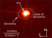 Диаметр Эриды был определен в 2006 году с помощью аппаратуры Космического телескопа имени Хаббла. Тогдашние измерения показали, что он равен 2400 километров (у Плутона 2306 километров). Позднее сотрудник Института радиоастрономии Общества Макса Планка Фрэнк Бертольди (Frank Bertoldi) поднял средний диаметр Эриды до 3000 километров. Так что в любом случае она больше Плутона.